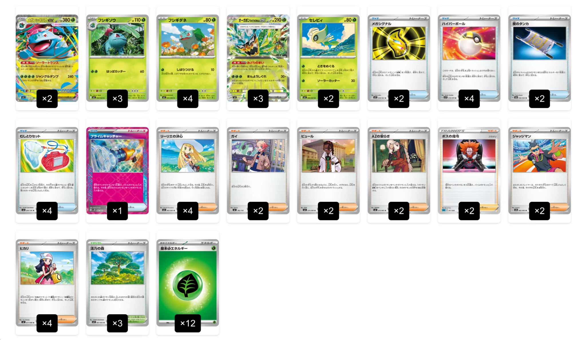 みどりのまいでエネルギー加速しながらドロー。活力の森で一気にメガフシギバナexに進化し、HP380の高いHPと回復できるワザで粘り強く戦う耐久型デッキ。