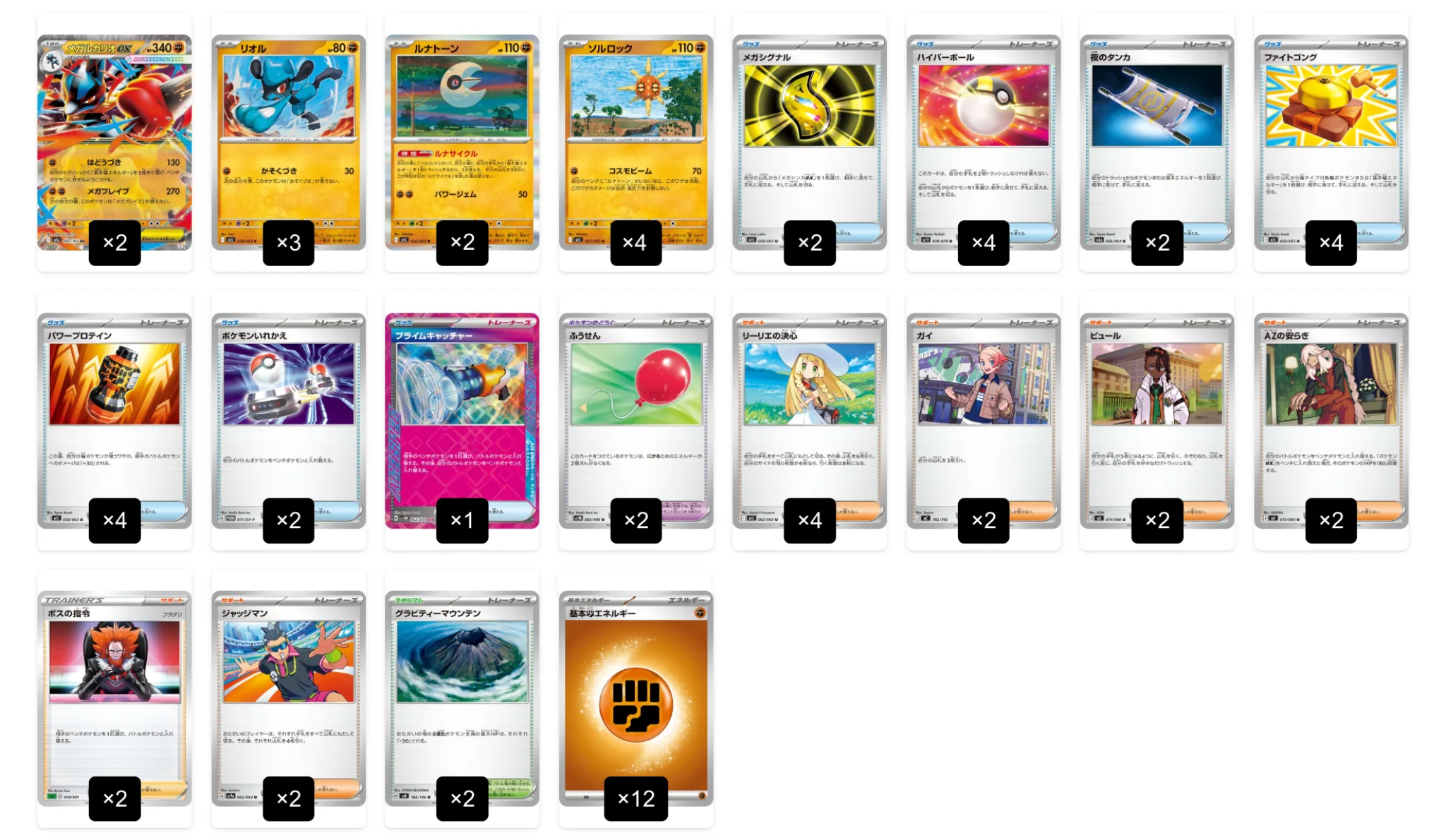 ルナトーン・ソルロックの山札を引く特性で手札を整え、メガルカリオexで序盤から大ダメージを与えることができる、攻撃型デッキ